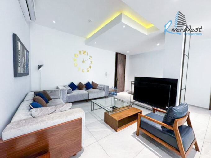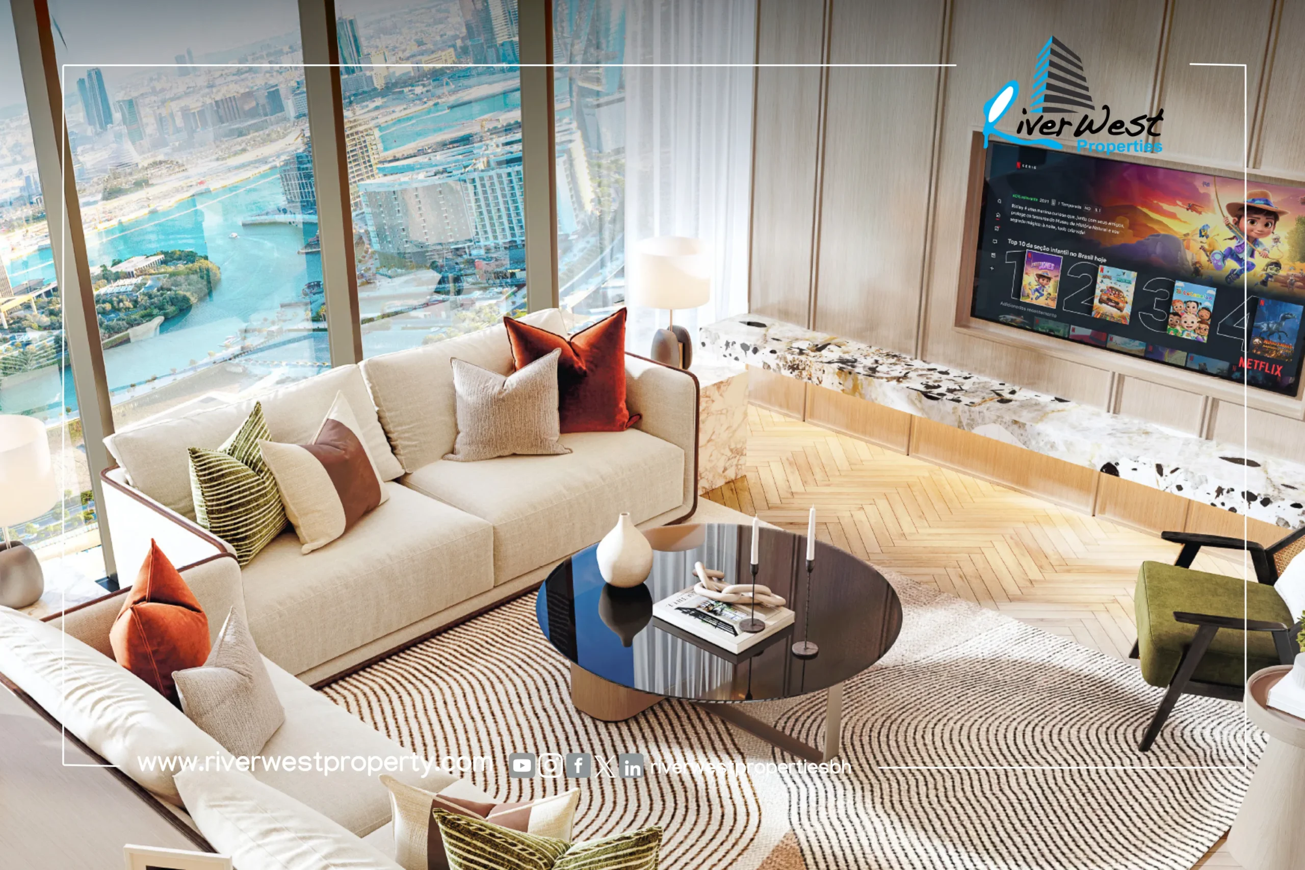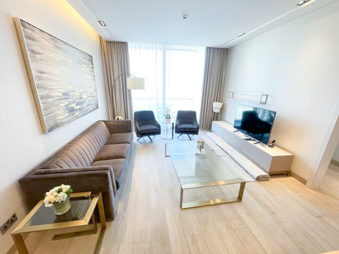 The apartment features an open-plan living and dining area, a semi-open fitted kitchen, and spacious bedrooms with modern bathrooms. Floor-to-ceiling glazing enhances natural light and connects the interiors with impressive city and waterfront views.