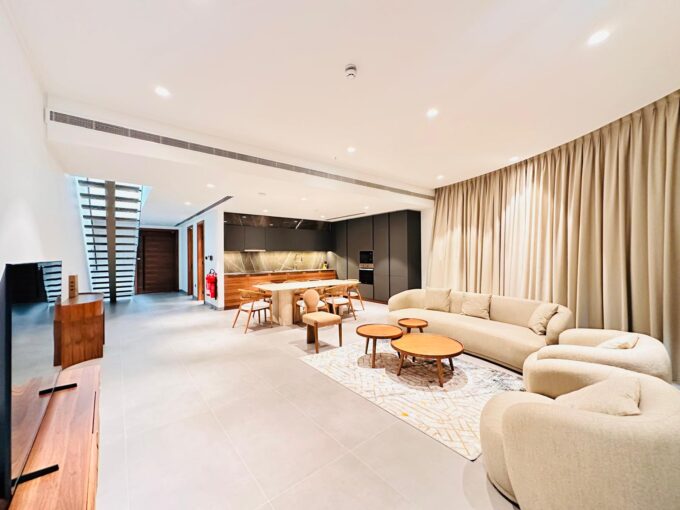 The apartment is thoughtfully designed with an open-plan living and dining area, a semi-open fitted kitchen, and generously sized bedroom spaces. Floor-to-ceiling windows enhance natural light while creating a seamless connection between indoor comfort and outdoor views.