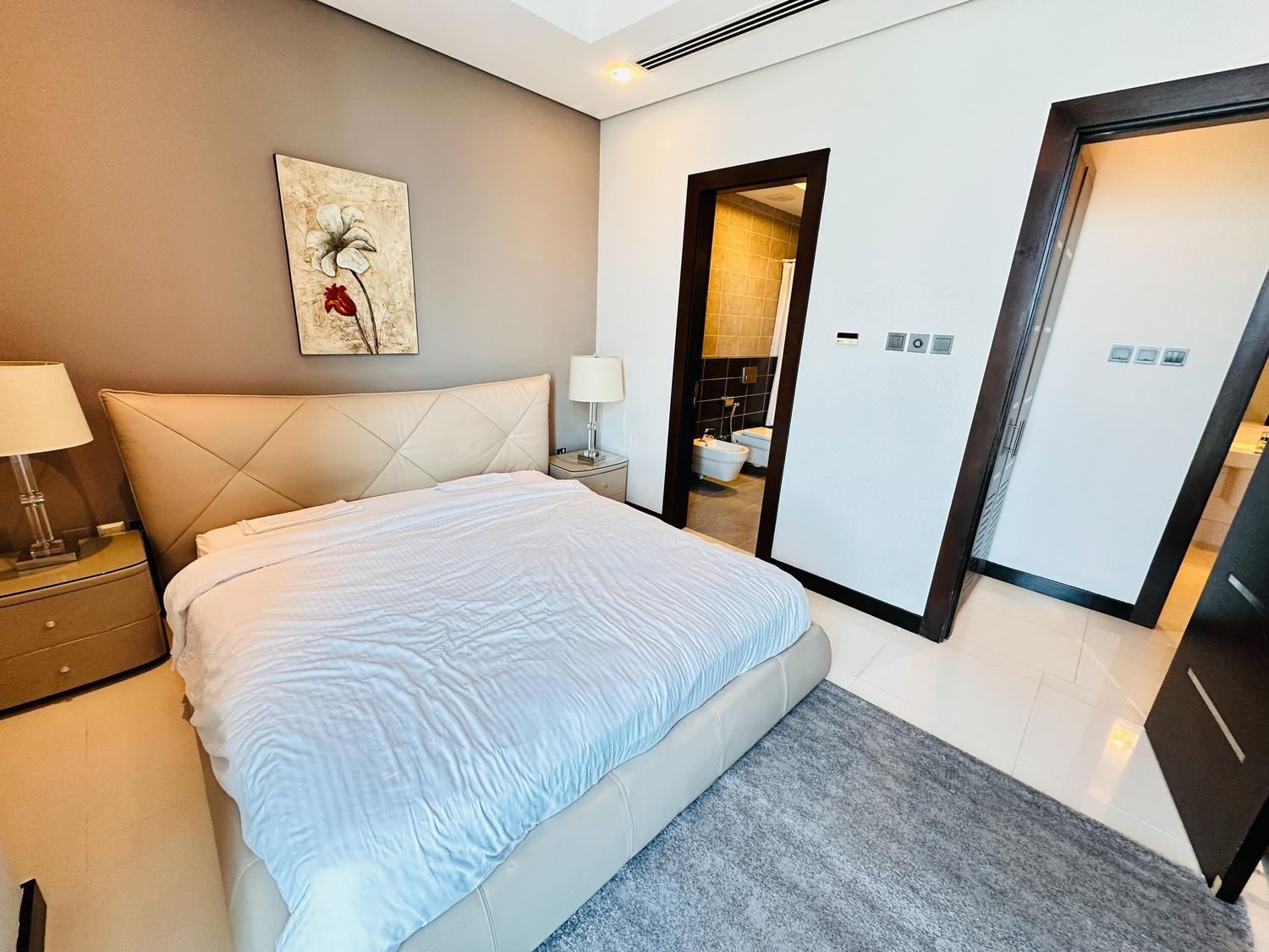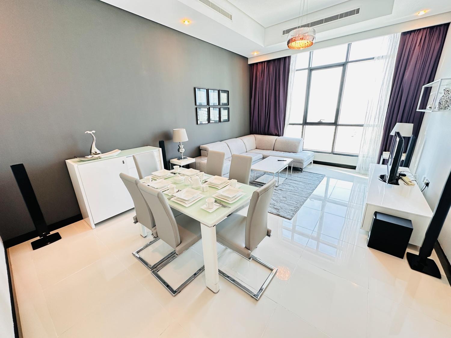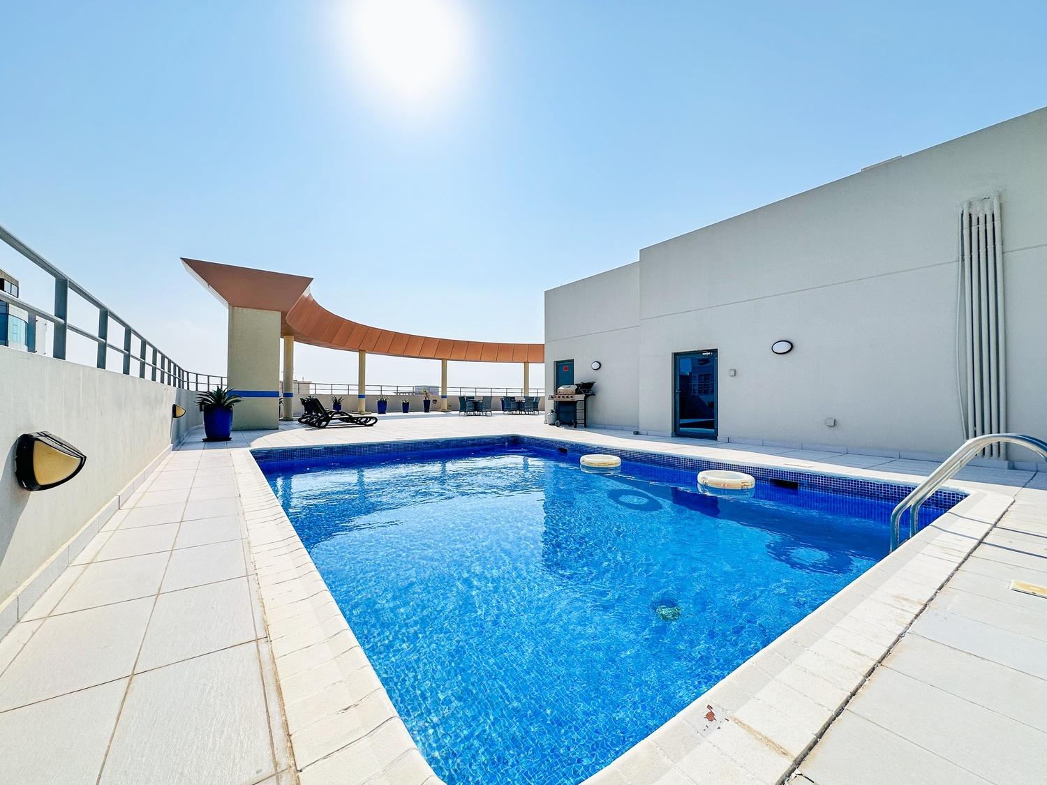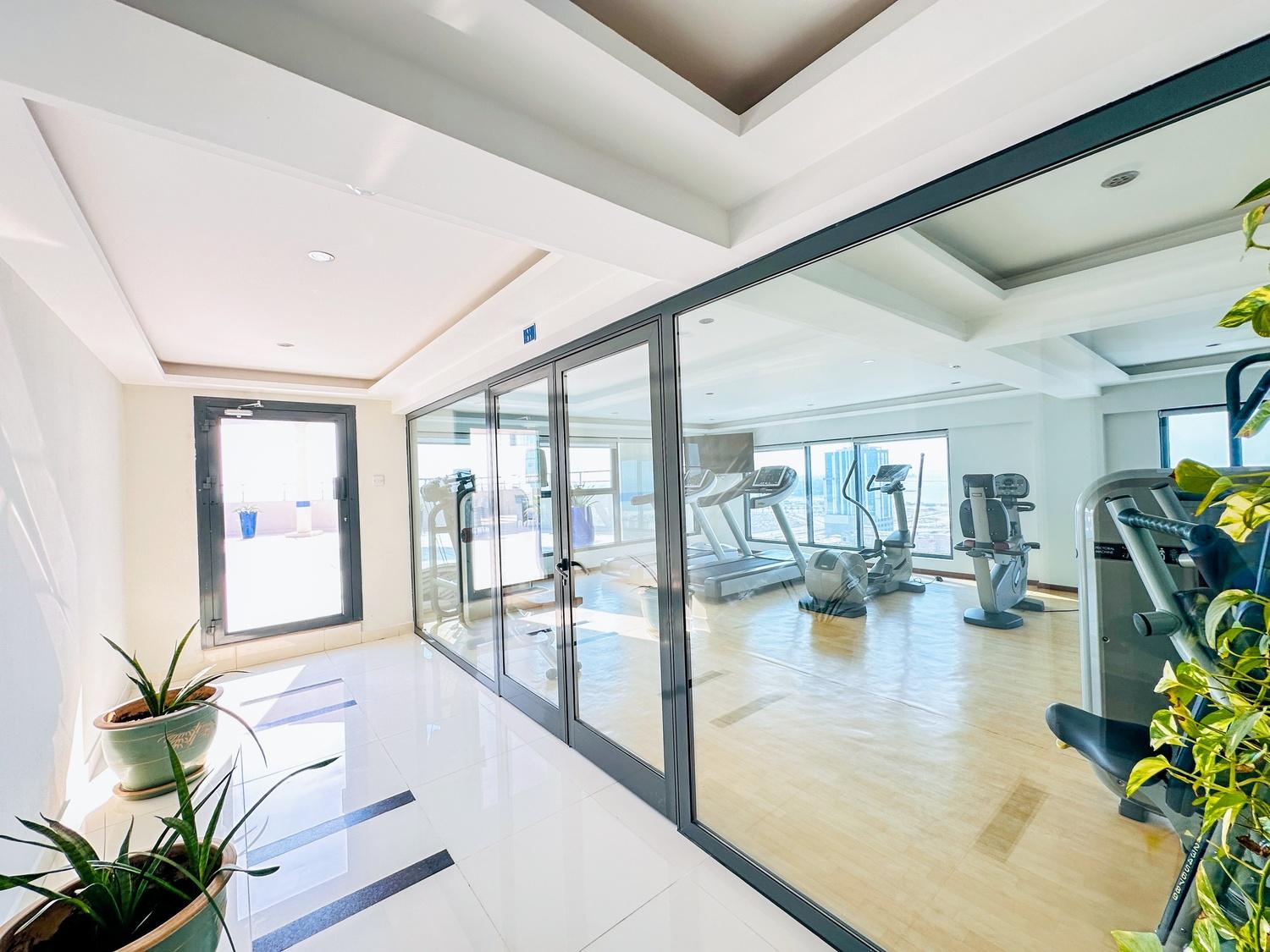 This modern fully furnished 2-bedroom apartment offers a bright living space with beautiful city and sea views. Located near Seef Mall, it features a living hall, dining area, closed kitchen, laundry space, and central AC. Residents enjoy access to excellent facilities including a pool, gym, BBQ area, steam, and sauna. Inclusive of EWA (30 BD cap), internet, and housekeeping. One parking provided.