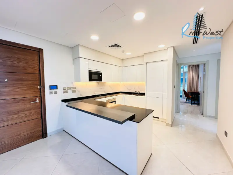 The apartment is situated on a middle floor with stunning City View from its two private balconies. It is delivered fully furnished with modern, high-quality finishes and includes key appliances like a dishwasher and central AC. The spacious open-concept living and dining areas lead to an efficient open kitchen with an electric glass stove.